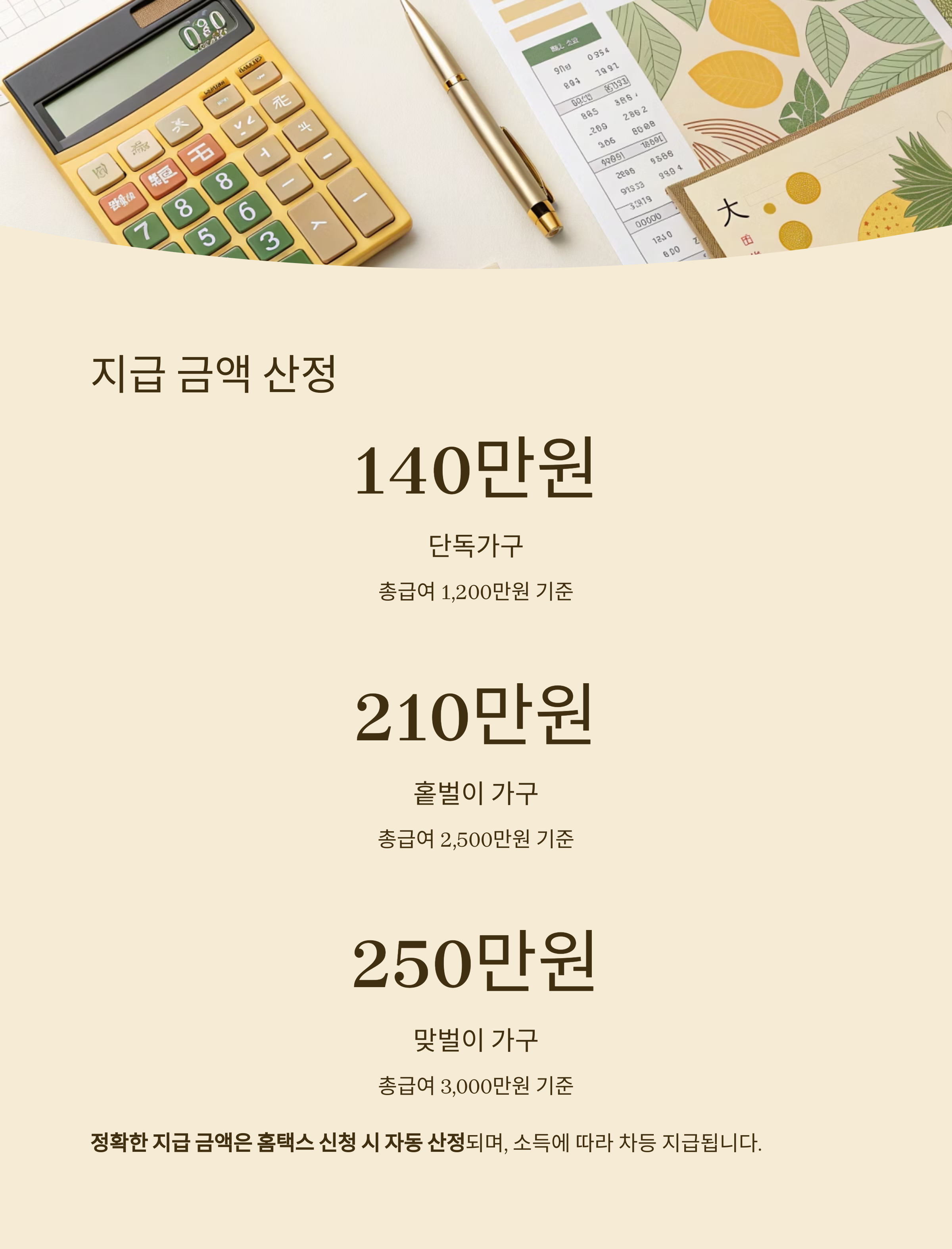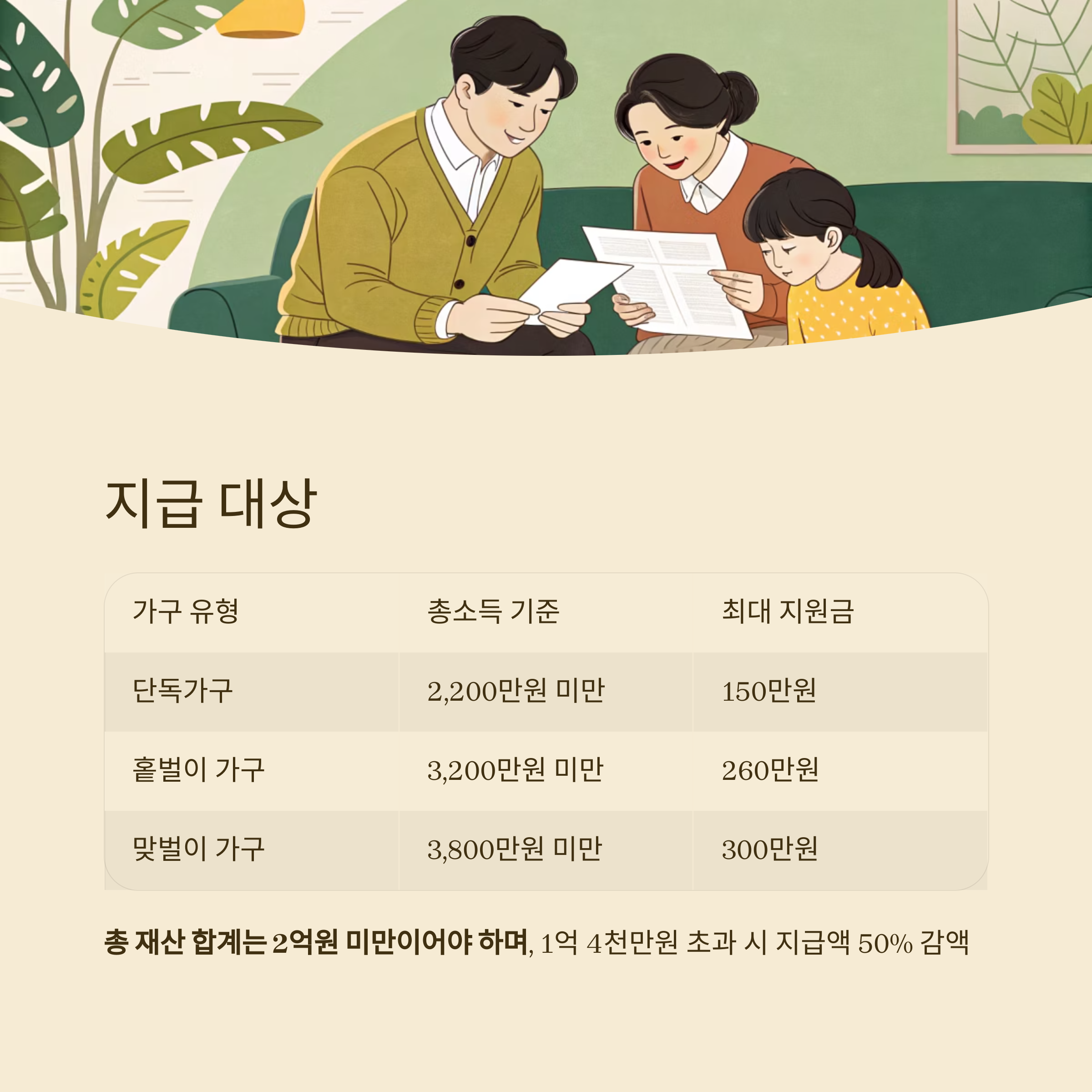 | 홑벌이 가구 | 3,200만 원 미만 | 최대 260만 원 |